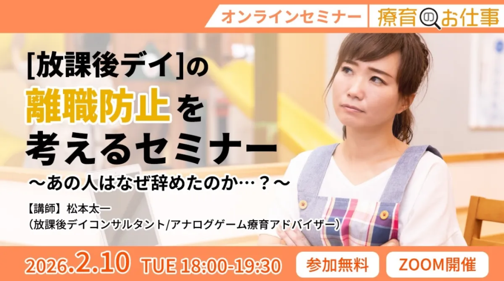 本セミナーでは、放課後等デイサービスの離職の要因を具体的な事例をもとに考えながら、コミュニケーションやルール作りといった具体的な打ち手を検討し、離職防止について考える機会としたいと考えています。