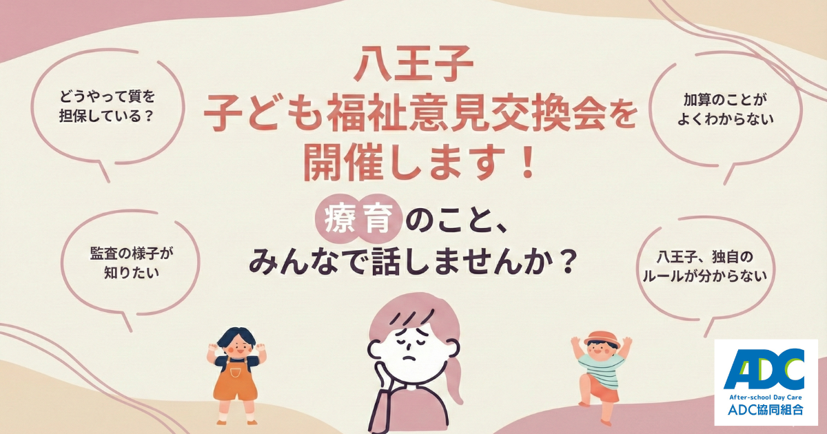 日頃より、地域の子ども福祉にご尽力いただきありがとうございます。 ADC協同組合より、事業所様向けの意見交換会開催のお知らせです。